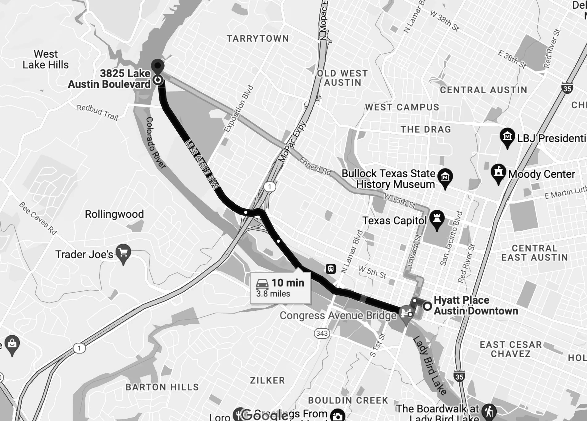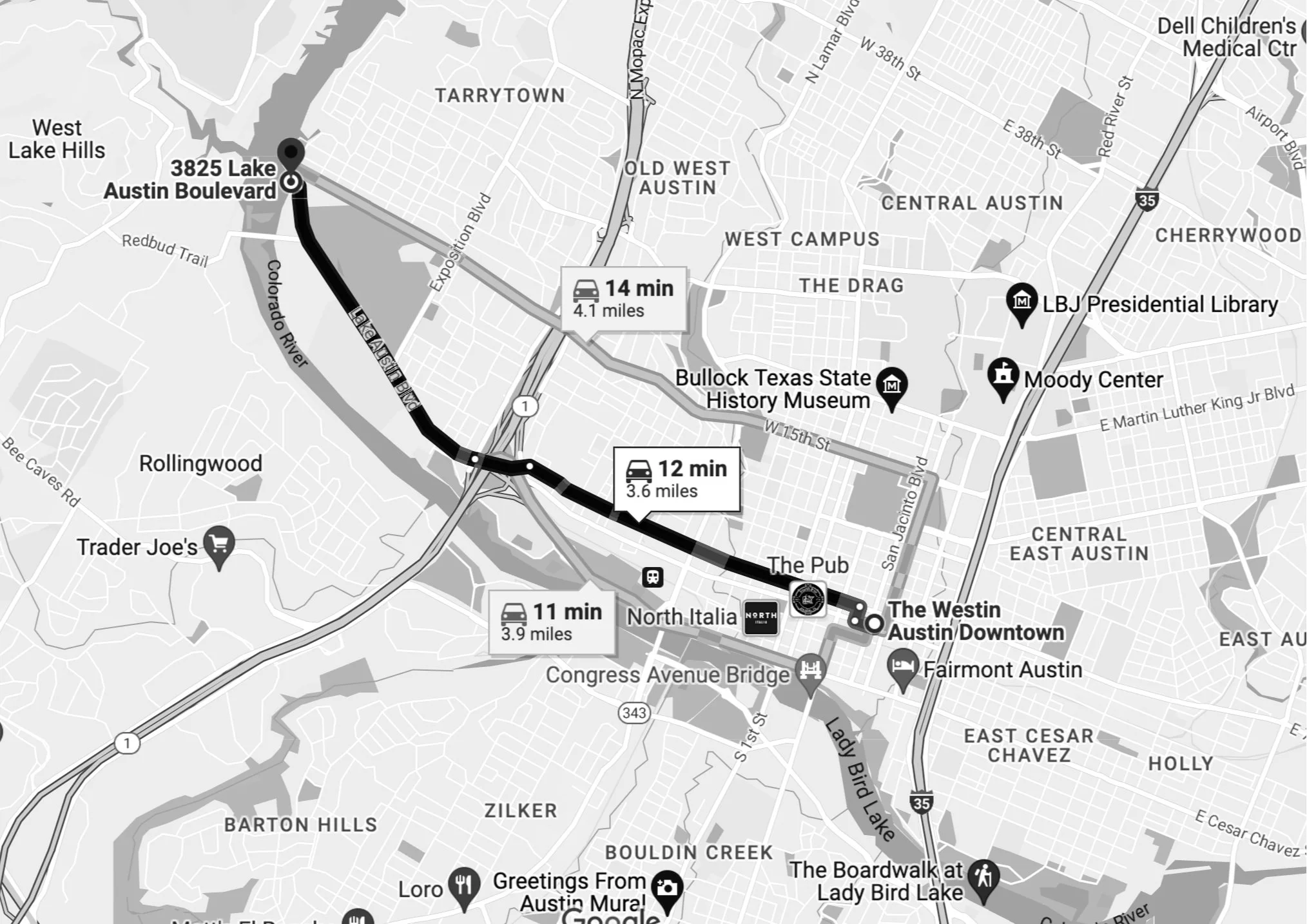 Location from boat dock: 15 to 20-minute drive straight down Mopac (Loop 1) Google Maps
